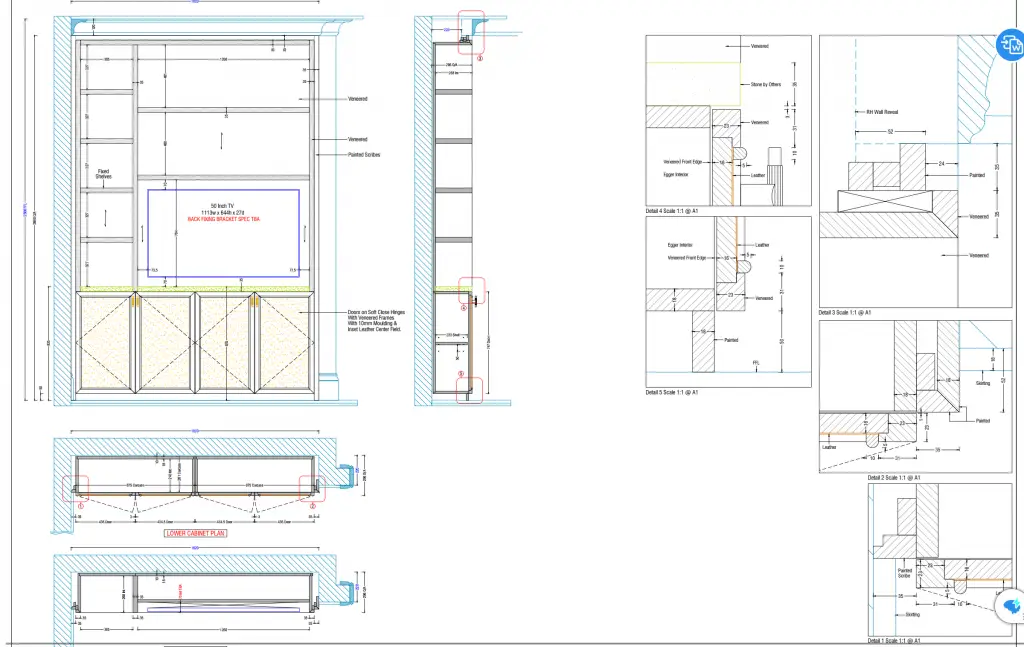 We produce workshop-ready shop drawings and, if required, cutting lists. You can pass these directly to your cabinet maker, or we can coordinate with your joinery team to make sure everything is clear.